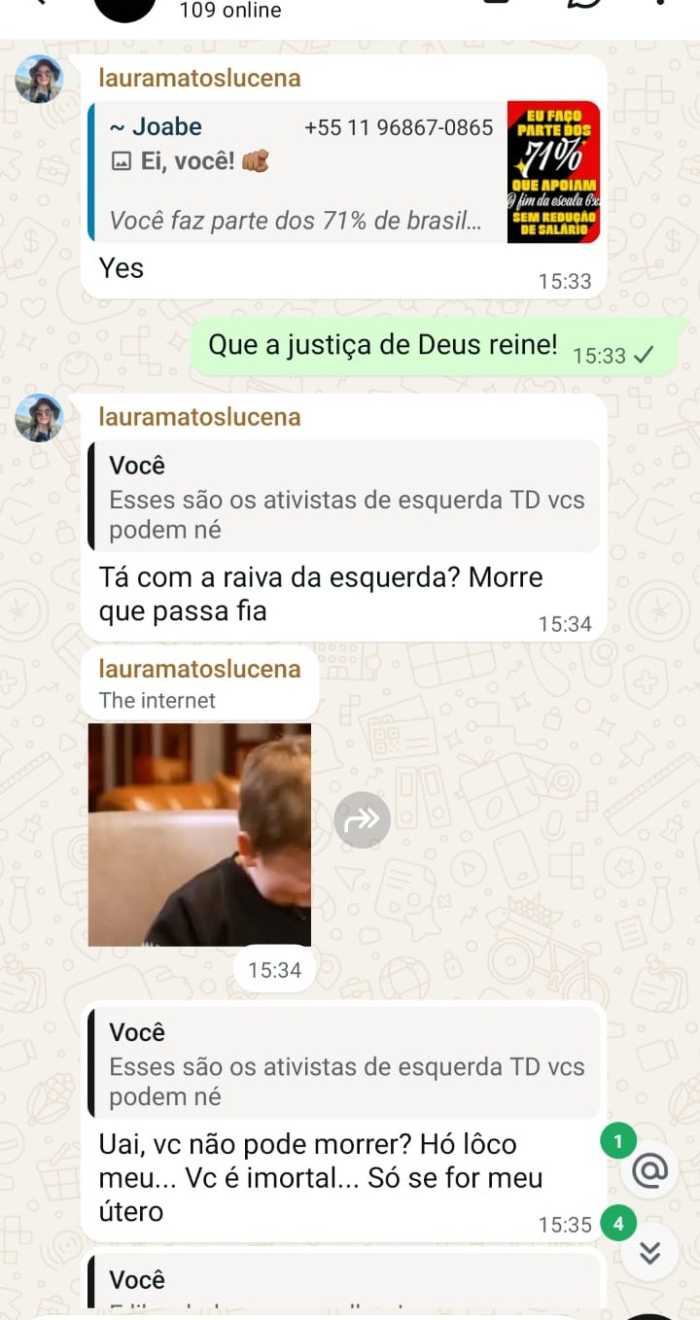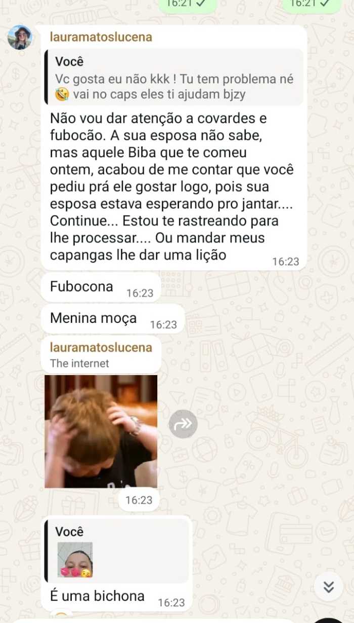 De acordo com os registros das interações, a identificada como Laura Matos Lucena proferiu uma sequência de ataques nominais a Irene Lopes. A agressividade atingiu o ápice quando as ofensas evoluíram para ameaças diretas à integridade física da vítima.